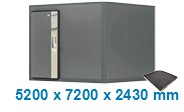 Matrix koelcel voor positieve of negatieve toepassingen, met vloer. | Interne afmetingen: 5200 x 7200 x 2430 mm. | Externe afmetingen: 5500 x 7500 x 2730 mm. | Wand- en plafonddikte: 150 mm. | Kleur: uitwendig basalt grijs gelakt (RAL7012), inwendig wit (REF1006) | Vloer (dikte: 150mm) met anti-slip fenoliek bekleding (draagkracht: 3000 kg/m² statische belasting // 500 kg dynamische belasting bij verdeling op 4 rubberen wielen). Inclusief 1 negatieve vlakke draaideur van 140mm dik, dagmaat: 1900 x 800mm, in een paneel van 2030 x 1200 mm. De deur wordt aangeleverd inclusief Fermod sluiting (model 821) met sleutel, noodontgrendeling, kunststof regelbare scharnieren, deurdichting , sleeprubber en kunststof versterkte deurdorpel. Het deurvlak wordt voorzien van een INOX verticale strook, aan de zijde van de sluiting, deze zorgt voor een visuele upgrade en langere levensduur.