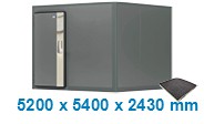 Matrix koelcel voor uitsluitend positieve toepassingen, met vloer. | Interne afmetingen: 5200 x 5400 x 2430 mm. | Externe afmetingen: 5320 x 5520 x 2575 mm. | Wand- en plafonddikte: 60 mm. | Kleur: uitwendig basalt grijs gelakt (RAL7012), inwendig wit (REF1006) | Vloer (dikte: 85mm) met anti-slip fenoliek bekleding (draagkracht: 3000 kg/m² statische belasting // 500 kg dynamische belasting bij verdeling op 4 rubberen wielen). Inclusief 1 positieve draaideur met een convex deurblad van 80mm dik, dagmaat: 1900 x 800mm, in een paneel van 2030 x 1200 mm. De deur wordt aangeleverd inclusief Fermod sluiting (model 821) met sleutel, noodontgrendeling, kunststof regelbare scharnieren, deurdichting , sleeprubber en kunststof versterkte deurdorpel. Het deurvlak wordt voorzien van een INOX verticale strook, aan de zijde van de sluiting, deze zorgt voor een visuele upgrade en langere levensduur.