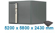 Matrix koelcel voor uitsluitend positieve toepassingen, met vloer. | Interne afmetingen: 5200 x 5800 x 2430 mm. | Externe afmetingen: 5320 x 5920 x 2575 mm. | Wand- en plafonddikte: 60 mm. | Kleur: uitwendig basalt grijs gelakt (RAL7012), inwendig wit (REF1006) | Vloer (dikte: 85mm) met anti-slip fenoliek bekleding (draagkracht: 3000 kg/m² statische belasting // 500 kg dynamische belasting bij verdeling op 4 rubberen wielen). Inclusief 1 positieve draaideur met een convex deurblad van 80mm dik, dagmaat: 1900 x 800mm, in een paneel van 2030 x 1200 mm. De deur wordt aangeleverd inclusief Fermod sluiting (model 821) met sleutel, noodontgrendeling, kunststof regelbare scharnieren, deurdichting , sleeprubber en kunststof versterkte deurdorpel. Het deurvlak wordt voorzien van een INOX verticale strook, aan de zijde van de sluiting, deze zorgt voor een visuele upgrade en langere levensduur.