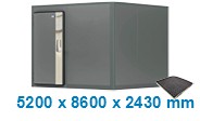 Matrix koelcel voor positieve of negatieve toepassingen, met vloer. | Interne afmetingen: 5200 x 8600 x 2430 mm. | Externe afmetingen: 5370 x 8770 x 2600 mm. | Wand- en plafonddikte: 85 mm. | Kleur: uitwendig basalt grijs gelakt (RAL7012), inwendig wit (REF1006) | Vloer (dikte: 85mm) met anti-slip fenoliek bekleding (draagkracht: 3000 kg/m² statische belasting // 500 kg dynamische belasting bij verdeling op 4 rubberen wielen). Inclusief 1 positieve draaideur met een convex deurblad van 80mm dik, dagmaat: 1900 x 800mm, in een paneel van 2030 x 1200 mm. De deur wordt aangeleverd inclusief Fermod sluiting (model 821) met sleutel, noodontgrendeling, kunststof regelbare scharnieren, deurdichting , sleeprubber en kunststof versterkte deurdorpel. Het deurvlak wordt voorzien van een INOX verticale strook, aan de zijde van de sluiting, deze zorgt voor een visuele upgrade en langere levensduur. Indien u de koelcel gebruikt voor negatieve toepassingen, moet u de draaideur wijzigen naar een negatieve versie (140 mm) met randverwarming.