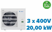 Buitentoestel PACi Elite. Nominaal koelvermogen: 19,0 kW. Nominaal verwarmingsvermogen: 22,4 kW. Voedingsspanning: 3x400V+N~50Hz. Verwarmen tot bij -20°C. Koelen tot bij -15°C. Koudemiddel: R32.